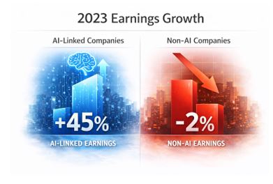 After years of underperformance, valuation discipline, improving earnings trends, and currency dynamics finally aligned. Energy prices fell, inflation stabilized, and rates edged lower — creating a foundation for broader participation going forward. Two years ago, earnings growth for non-AI companies was negative. Last year, AI still led the way, but the gap narrowed.