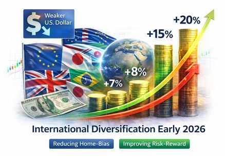 A weaker US dollar early in 2026 acts as a tailwind for non-US assets. A weaker dollar historically acts as oxygen for international and emerging market assets. When paired with improving earnings trends abroad and a narrowing growth gap, the risk-reward outside the U.S. improves materially. This does not imply abandoning U.S. assets, but it does argue against home-country bias at a time when diversification is finally being paid to wait. Combined with lower starting valuations and improving earnings trends, this creates a favorable setup for international equities.