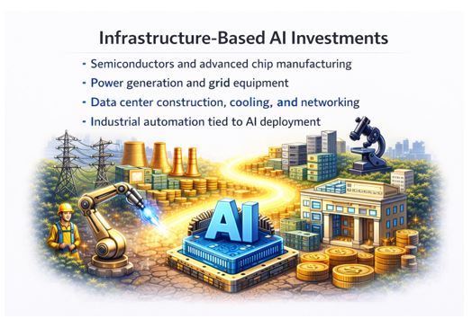 - Semiconductors and advanced chip manufacturing- Power generation and grid equipment- Data center construction, cooling, and networking- Industrial automation tied to AI deployment. The buildout required to support AI is massive. Data centers, grid reliability, power generation, and semiconductors all sit upstream of the applications investors see on the surface. This is where capital intensity is highest—and where earnings visibility can be strongest. These are not short-term trades. They are multi-year capital cycles that resemble prior infrastructure booms — railroads, electrification, highways — not dot-com excess. That said, valuation discipline matters. Not every AI stock is an AI investment.