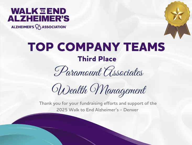 Paramount Associates Wealth Management is honored to be recognized as a Top Company Team, earning Third Place in the 2025 Walk to End Alzheimer’s – Denver. This award celebrates our team’s commitment to fundraising and supporting the Alzheimer’s Association’s mission to advance research, provide care, and promote awareness for those affected by Alzheimer’s disease. We’re proud to stand alongside our community in the fight to end Alzheimer’s and grateful to everyone who contributed to this meaningful cause.